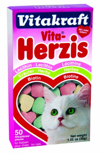 Friandise Vita-Herzis Les Herzis Assortis sont de petites friandises riches en protéine, qui apportent vitalité et joie de vivre à nos compagnons. En forme de coeur ses pastilles des couleurs et apports différents: La Lécithine qui active le fonctionnement du cerveau et des nerfs, l'Herbe qui facilite le transit intestinal et la Biotine qui donne un beau pelage brillant. Ces friandises, source de bien être et d'énergie pour les chats, favorisent une vie saine et active Boite de 50 coeurs.