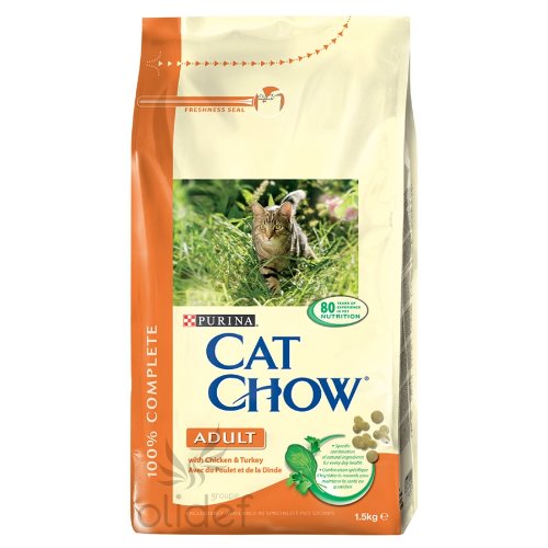 Aliment 100 % complet et équilibré (34 % de protéines et 1 2% de matières grasses) pour les chats adultes ayant une activité normale. Préparé avec du poulet, de la dinde, des herbes et des légumes de première qualité. Ingrédients Céréales, viandes et sous-produits animaux (poulet min. 4%, dinde min. 4%), extraits de protéines végétales (soja min. 2%), huiles et graisses (extraits de romarin min. 0,006%), sous-produits d'origine végétale (tourteau de colza min. 0,05%), légumes (carottes min. 0,5%, épinards min. 0,5%, persil min. 0,2%, chicorée min. 0,5%), substances minérales, levures. Analyse moyenne Protéine brute 34%, Matières grasses brutes 12%, Cendres brutes 8%, Cellulose brute 3%, Calcium 1,2%, Phosphore 1,2%. Vous pouvez télécharger le catalogue de la gamme CAT CHOW au format PDF (Adobe Acrobat Reader) ici . Si vous ne disposez d'Adobe Acrobat Reader sur votre ordinateur, vous pouvez le télécharger ici .