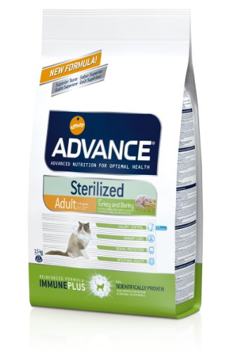 Advance SterilizedINDICATIONSAliment complet et équilibré sous forme de croquettes savoureuses, recommandé spécialement comme régime alimentaire pour chats stérilisés qui:Aide à prévenir l'obésité chez les chats stérilisés grâce à:Une faible valeur énergétique métabolisable.Un niveau élevé de fibres afin de rassasier l'animal.Un apport élevé en protéines et modéré en matières grasses pour aider au maintien de la masse musculaire.Aide à réduire le risque de troubles urinaires en:favorisant un pH adapté;augmentant le taux de sodium pour inciter l'animal à boire plus et ainsi favoriser la diurèse;apportant des glycosaminoglycanes qui permettent de contrôler la formation de calculs urinaires.Améliore la sensibilité à l’insuline grâce à : un apport réduit en glucides et en orge comme principale source de glucides à libération lente.INGRÉDIENTSDinde (13 %), blé, gluten de maïs, maïs, gluten de blé, protéines déshydratées de porc, orge, protéines déshydratées de volaille, fibre de petit...